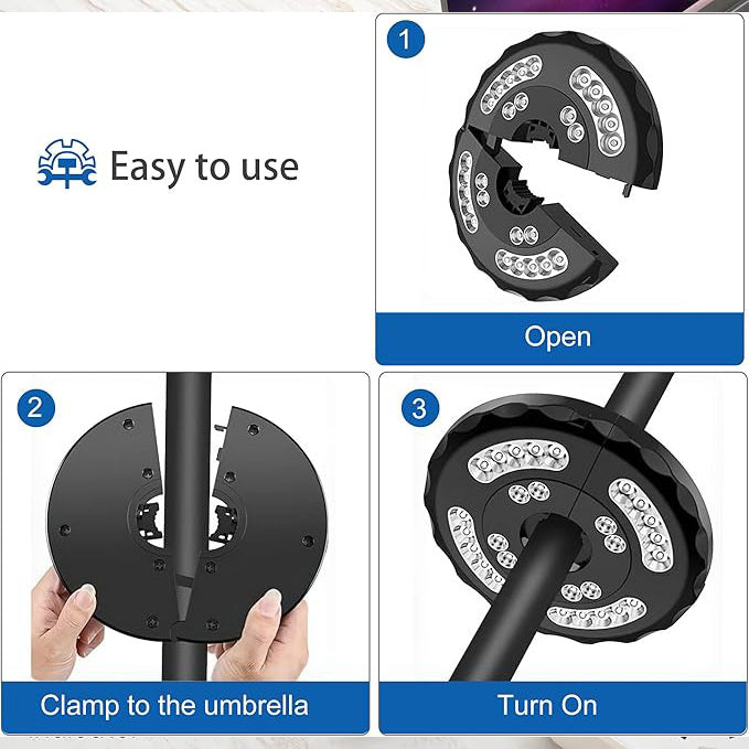 The unit is designed for attachment to most standard parasol frames. Installation requires no tools, and the design allows for removal or repositioning as needed.