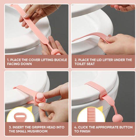 Toilet lifter seat using rope sleeve design is suitable for a variety of toilet seat.Each toilet cover handle is made of safe and soft silicone, easy and quick to install. Simply wrap the long strip around the toilet seat ring plate, put the mushroom sleeve into the opening at the other end and snap the notch to finish the installation.