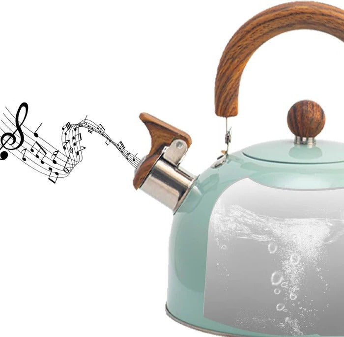 The kettle includes a built-in whistle that produces a clear sound once boiling temperature is reached. This feature helps prevent overboiling and reduces the likelihood of spills by prompting you to turn off the heat promptly.